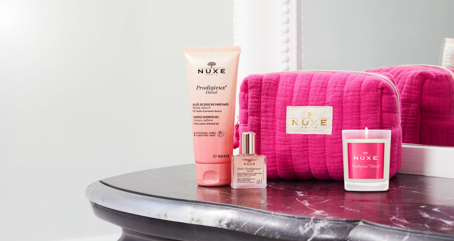 Élixir au bouquet pétillant, l'Huile prodigieuse® Florale est quant à elle associée au Baume à lèvres Very Rose dans un Duo Iconique Pink avec trousse assortie. Vous la retrouvez aussi accompagnée sa version Or enrichie en nacres d'origine naturelle aux reflets rose irisé ou dans le coffret La Fête en Rose.